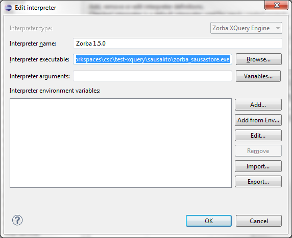 5) Now to add the new intepreter to Eclipse. Open Preferences -> XQuery -> Interpreters. Click the “Add…” button, then the “Browse” button. Navigate to the zorba-sausastore.exe file you just added, and select it. Eclipse should be able to inspect the file and set the default Interpreter name, e.g.,